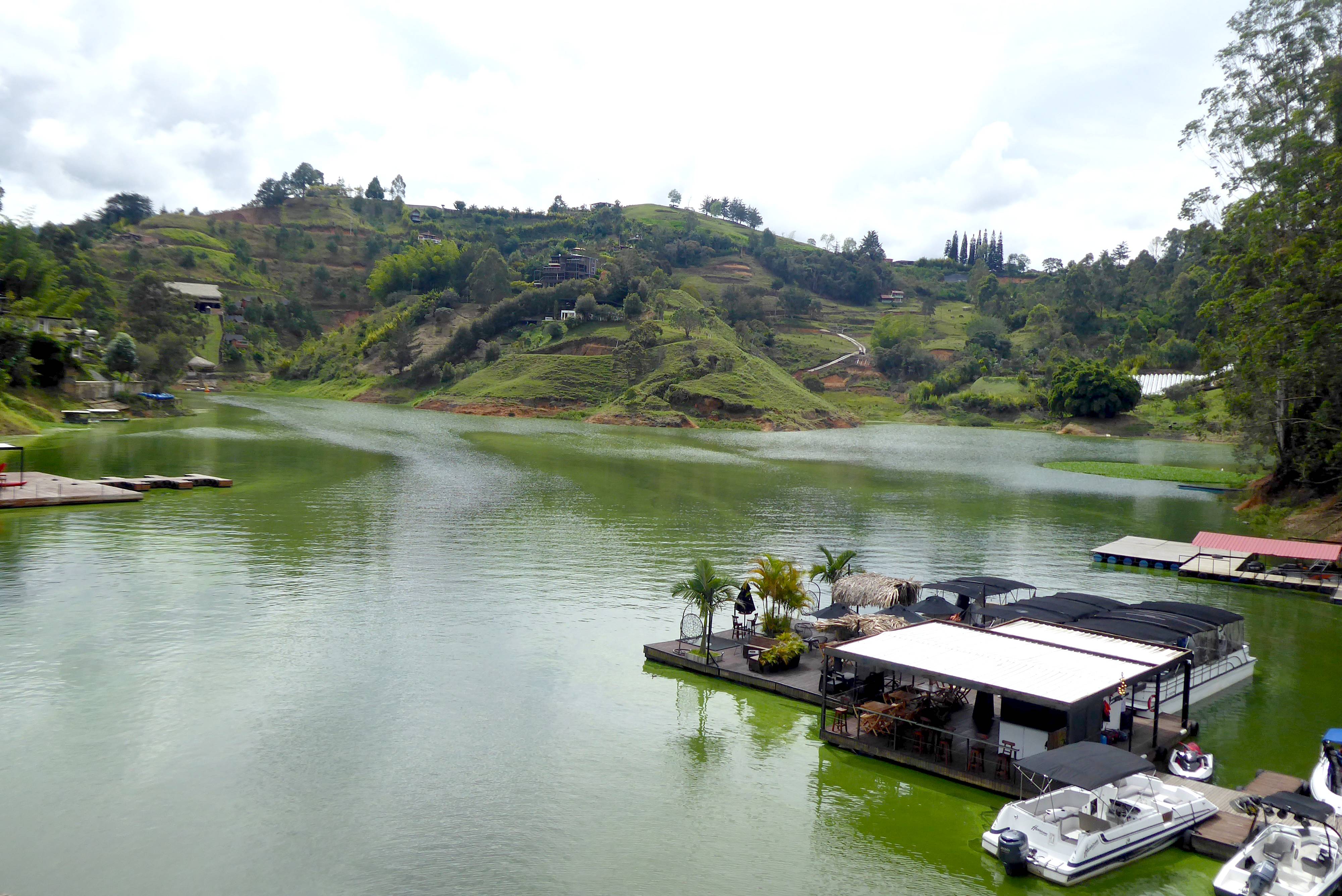 El Peñol looks over the huge lake called the Peñol-Guatapé Reservoir which is a man-made lake This was one scene of the lake that I caught from the bus. On curves you can get a glimpse of the lake but it is brief. The lake water level is down but is not as obvious in this picture.