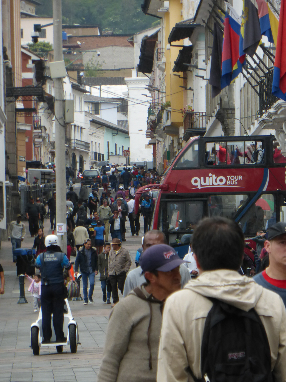 A busy walking street intersected with cross streets in the old section of Quito.