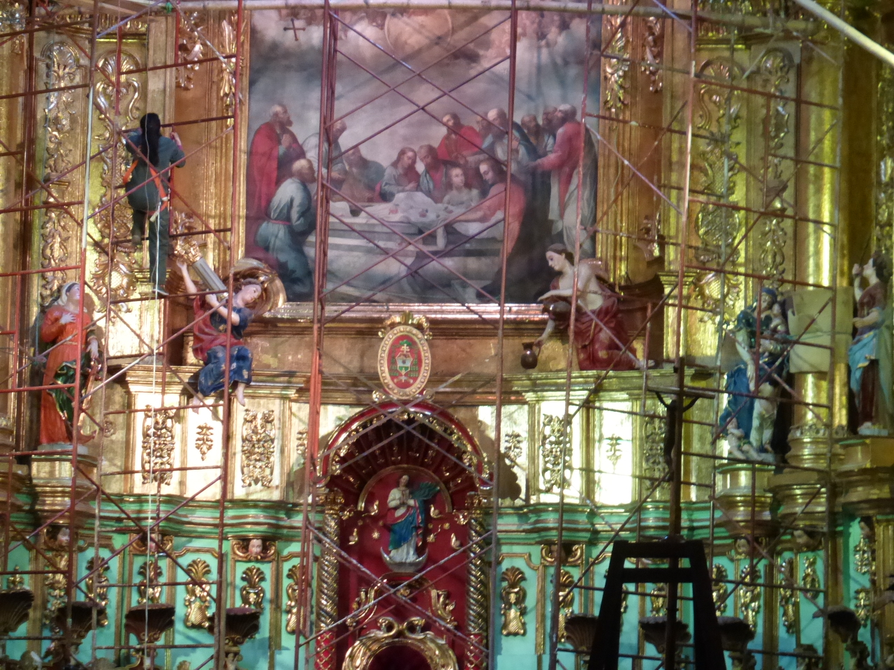The Cathedral of Quito is undergoing some renovation. We watched this young woman strap on climbing equipment and then she scaled the scaffolding to work on the upper levels.