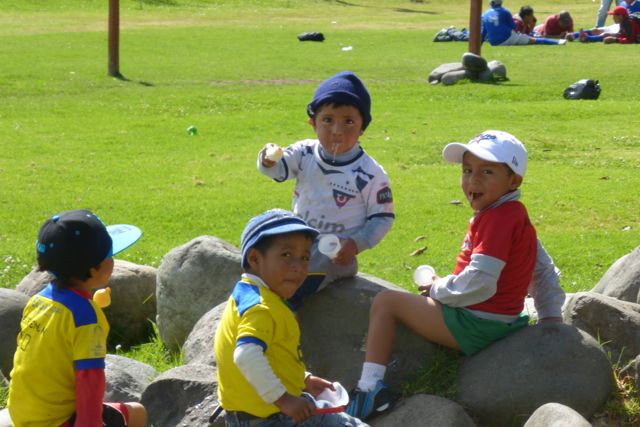 These miniature soccer players are finishing their ice cream break before running up and down the field again.