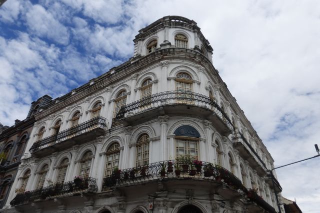A beautiful colonial era building reflecting the curve of the street going around it.