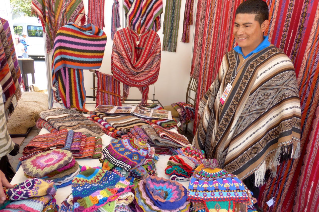 This is David Pimentel Quispe from Cusco, Peru, with his family's weavings. We were surprised to learn that all of the colors in the shawls and hats are natural dyes. The kids hats were especially cute and colorful.