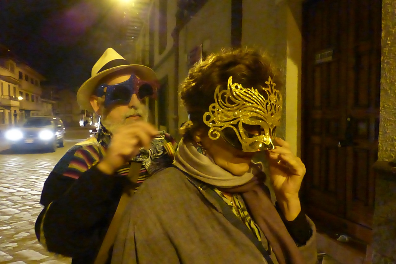 Winn is helping Ginger tie on her mask before entering the Halloween party.