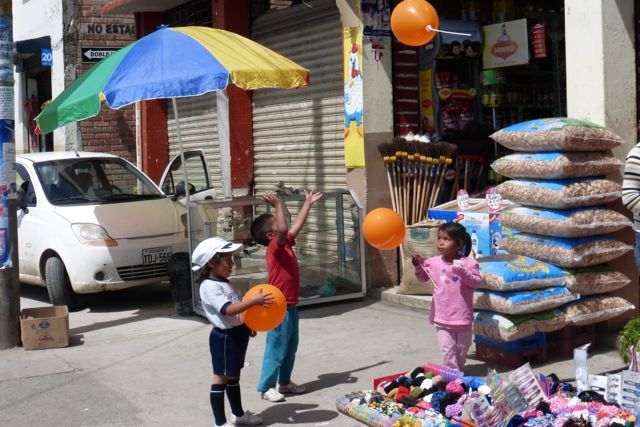 Children playing with orange balloons further down the street. This is the commerce area across the street from the big Feria Libre - farmer's market.