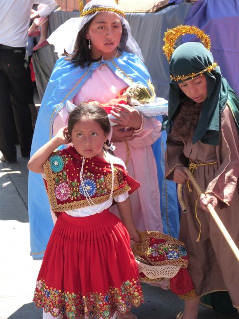 The older sister is cradling a baby Jesus while directing her siblings along the route.