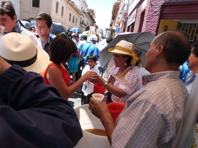 One Ecuadorean family prepared 7,000 liters of chicha (a sweet drink that is usually highly fermented but they said this one was very mild) and distributed it free to the public until their 50,000 cups ran out. Winn tried it and said it tasted like a fruit juice and did not have a buzz.