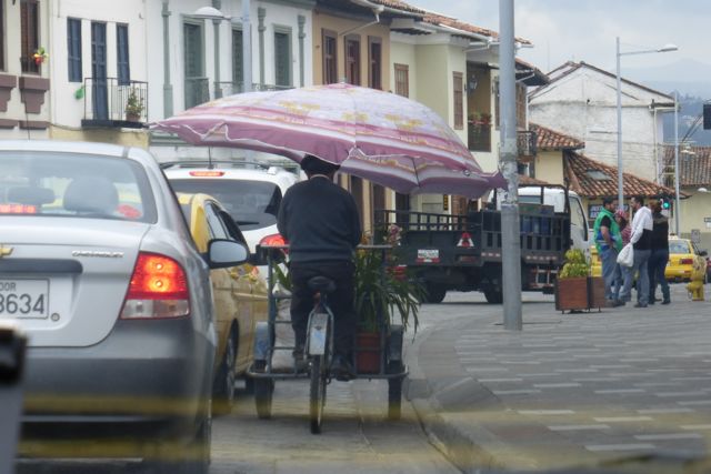 Talk about a hard commute! The orchid flower man seems to hold his own space even in heavy morning traffic.