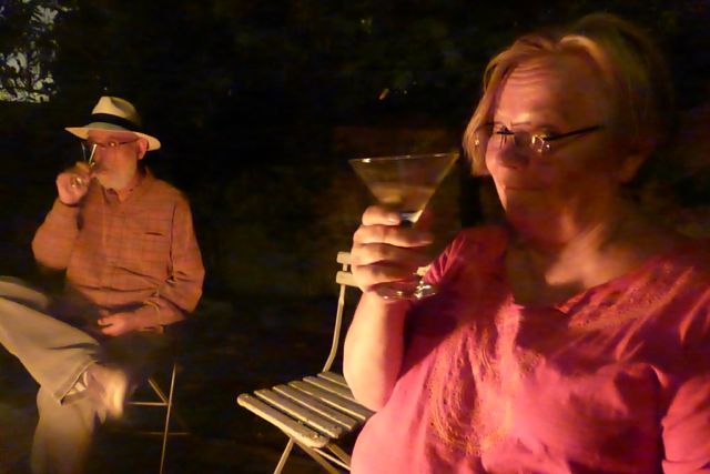 Winn had bought a martini mixer, glasses and liquor at a restaurant yard sale. Charles showed Winn how he likes to make martinis and here Stefani is showing her approval while Winn gets to the bottom of it.