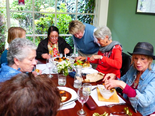 Here is more of lunch party at Salvia's. From the left, the woman in light blue is Gertie, a weaving friend. At the head of the table in black is Jeanne Chang who translates the headlines and cultural events page of the newspaper into English for her expat mailing list. The woman leaning over is Linda who loves jalapenos so much that she imports pounds of them every month from the states for restaurants and individuals. In red is our friend Sumana-a very enthusiastic foodie who organizes lunches like this. Next to her in the hat is Johanna who, we found out, used to live in our apartment at the Wunderbar!