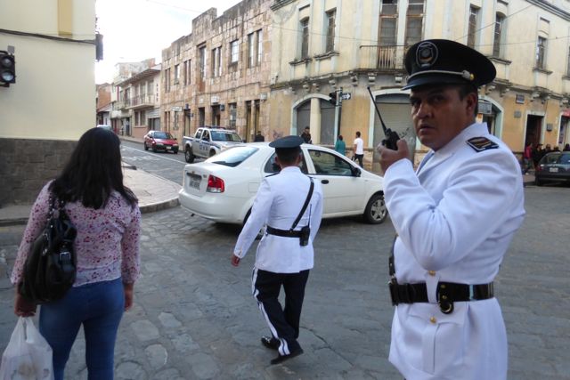 One day we saw these fancy-coated guards for several blocks. I stopped and asked this one if there was someone special in town. He nodded. I questioned 'Señor Correa?'. Another nod. President Correa was in town for the swearing in of the new Mayor. We didn't stick around to see him.