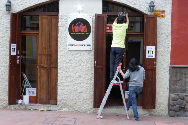 There are new shops opening left and right. This young couple is putting up the final signage before opening the Far Out bistro, night cafe and pub.