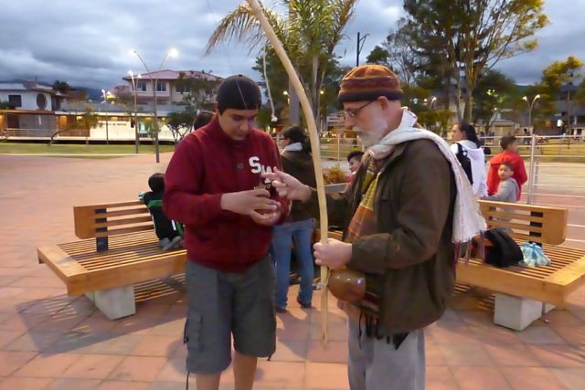 Winn is getting instruction on the instrument called Berimbau from Brazil. This and other instruments plus clapping are used during the Capoeira to set the pace between the players. The berimbau is made of a gourd, pole, string and small rock.