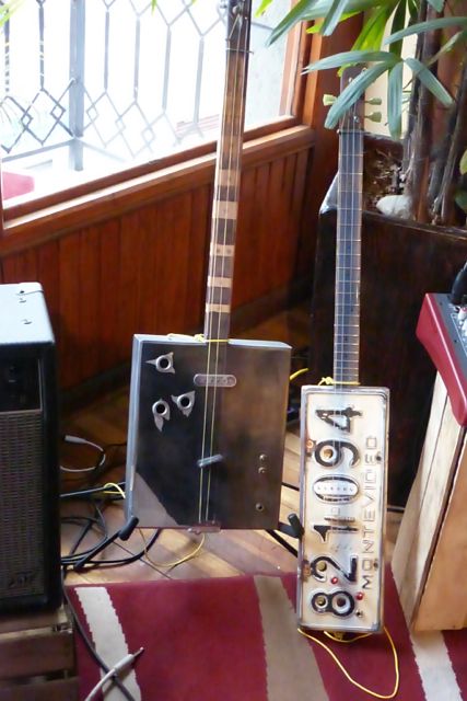 We were invited to a house party by Brad and Julienne who are the fabulous Musical Nomads. Among other instruments, they also play these guitars made from old boxes and license plates.
